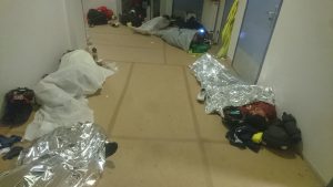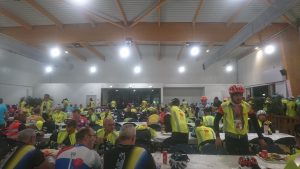My plan said I should ‘bounce’ Quédillac, but mind and body were insisting on another rest. I peered into the sports hall serving as a dormitory. Hundreds of snoozing cyclists were dimly visible, lying in numbered rows and columns like the spreadsheet I was turning my back on. A volunteer asked what time I wanted to be woken and wrote it down to avoid linguistic misunderstandings. He led me to my ‘cell’, where a mat and blanket waited. I took off a couple of layers then lay down into instant sleep. Half an hour later (yes, I hadn’t actually said goodbye to my buffer) I was woken, without disturbing my sleeping neighbours, by another volunteer. My first experiment with a PBP dorm had gone extremely well.
