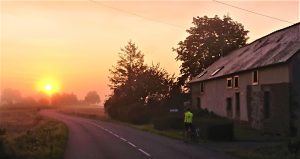 A weary first light embraced me as I descended into a very cold mist. This time fatigue struck quickly. I wanted to get off the bike but couldn’t see anywhere to rest until I spotted a grubby plastic chair in Ty Douar, a spattering of grey houses. I got off and dozed – perhaps for ten minutes but maybe much more. Too cold for deep sleep, my attention was caught by a fluttering pennant on a bike speeding past. I recognised Pete, a rider I had met on the ferry to Dieppe. The thought of saying hello spurred me into action and I set off in pursuit. We rode together, fighting the cold with conversation, until we reached Sizun and shivered into a condensation-filled café.